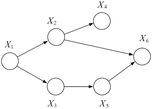 \[\begin{matrix} P\left( x_{1},x_{2},x_{3},x_{4},x_{5},x_{6} \right) = P\left( x_{1} \right)P\left( x_{2} \middle| x_{1} \right)P\left( x_{3} \middle| x_{1} \right)P\left( x_{4} \middle| x_{2} \right)P\left( x_{5} \middle| x_{3} \right)P\left( x_{6} \middle| x_{2},x_{5} \right)\ \tag{1} \\ \end{matrix}\]